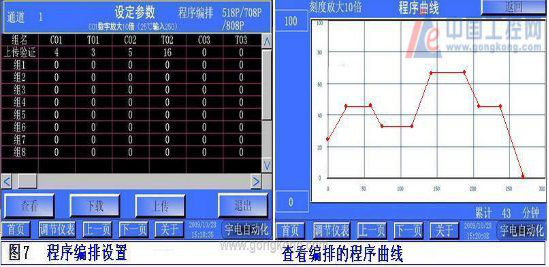 對(duì)于518P、708P、808P程序參數(shù)設(shè)置,點(diǎn)擊【A】框,進(jìn)入【手/自動(dòng)、編程設(shè)置控制平臺(tái)】;圖5所示的編程界面:出現(xiàn)【通道一程序編排設(shè)置】;程序編排平臺(tái)用組別配方來(lái)設(shè)置程序段【C01】和【T01】表示,以【組1】為例:點(diǎn)擊選中【組1】點(diǎn)擊組名【C01】下面的數(shù)據(jù)框輸入溫度值【250】(注:在溫度欄C01輸入的數(shù)值要放大10倍如25℃輸入的數(shù)據(jù)是【250】放大10倍);點(diǎn)擊組名T01下的時(shí)間段寫入實(shí)際時(shí)間值分鐘如15分鐘寫入【15】;設(shè)置好程序配方選中配方組如:【組1】在菜單條中點(diǎn)擊【查看】可看到已編排的曲線圖形;點(diǎn)擊【返回】;選中編輯好的配方組【組1】點(diǎn)擊【下載】操作,已編排的程序就下傳給程序儀表;即時(shí)可操作【運(yùn)行】【停止】【暫停】【手動(dòng)】【自動(dòng)】【返回】。采用【上傳驗(yàn)證】?jī)x表中的程序曲線來(lái)檢驗(yàn)程序是否下傳,程序配方可保存15組程序在觸摸屏中。圖7